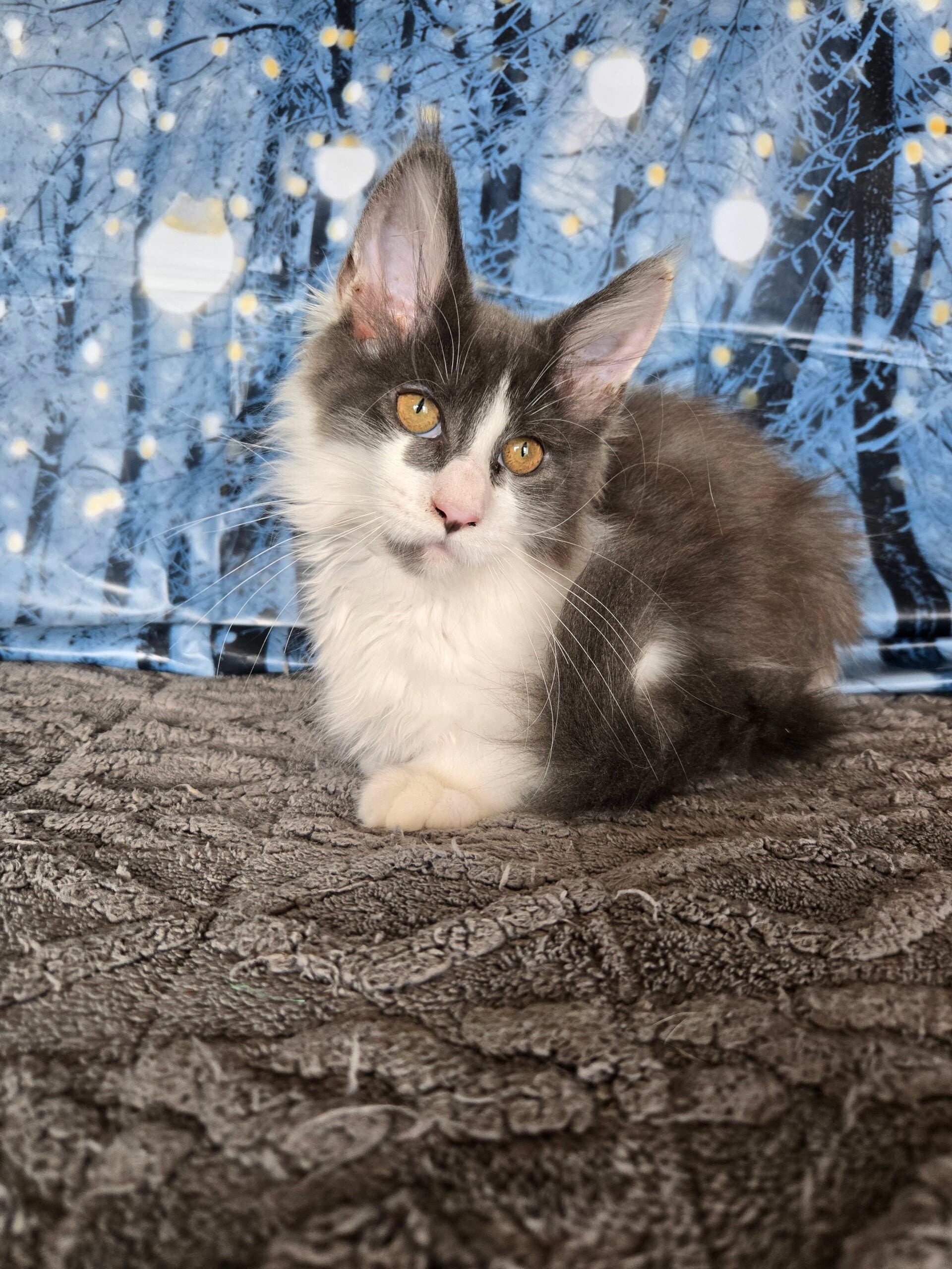 She is a black smoke with white and polydactyl with 7766 on her toes.